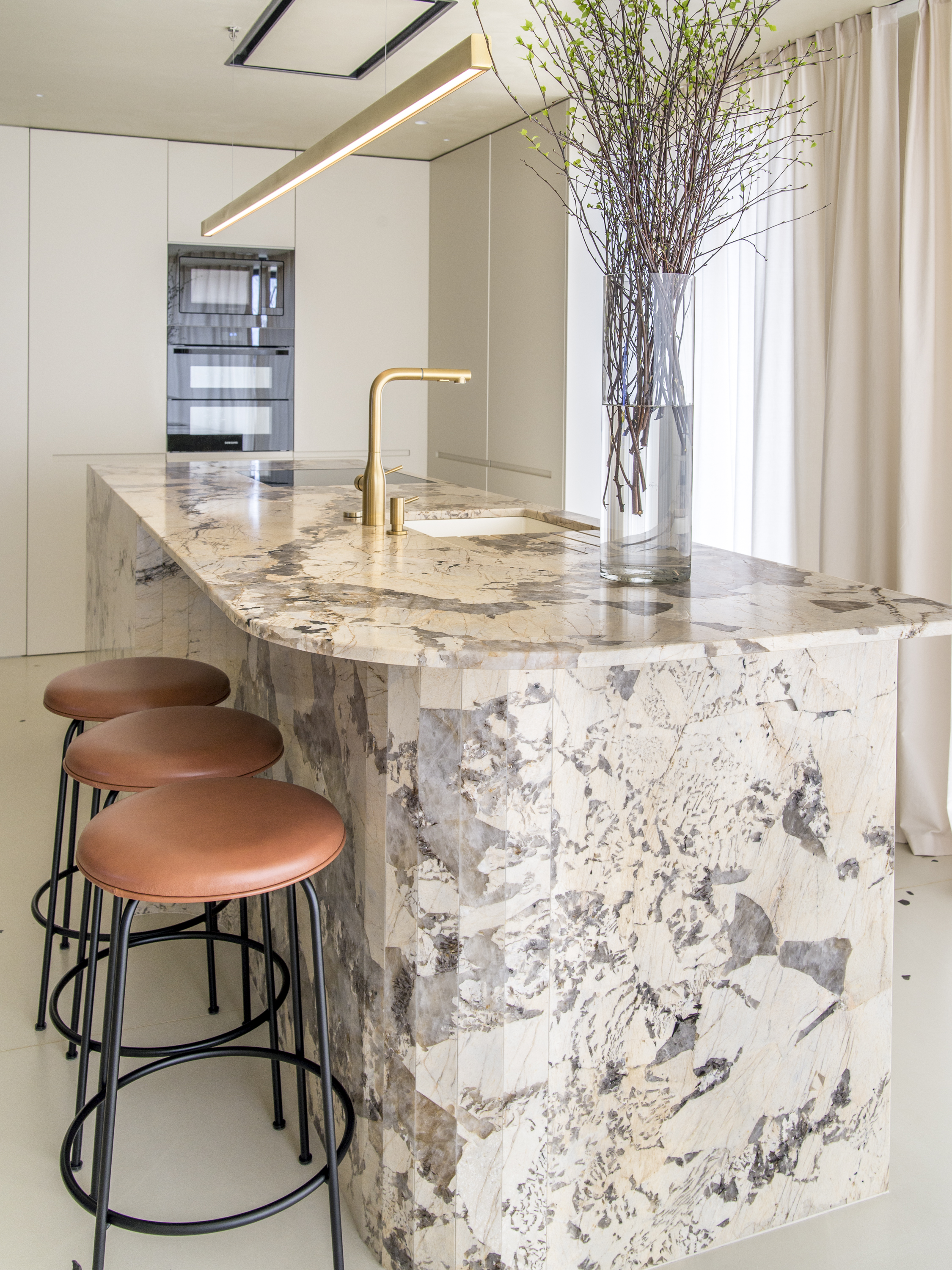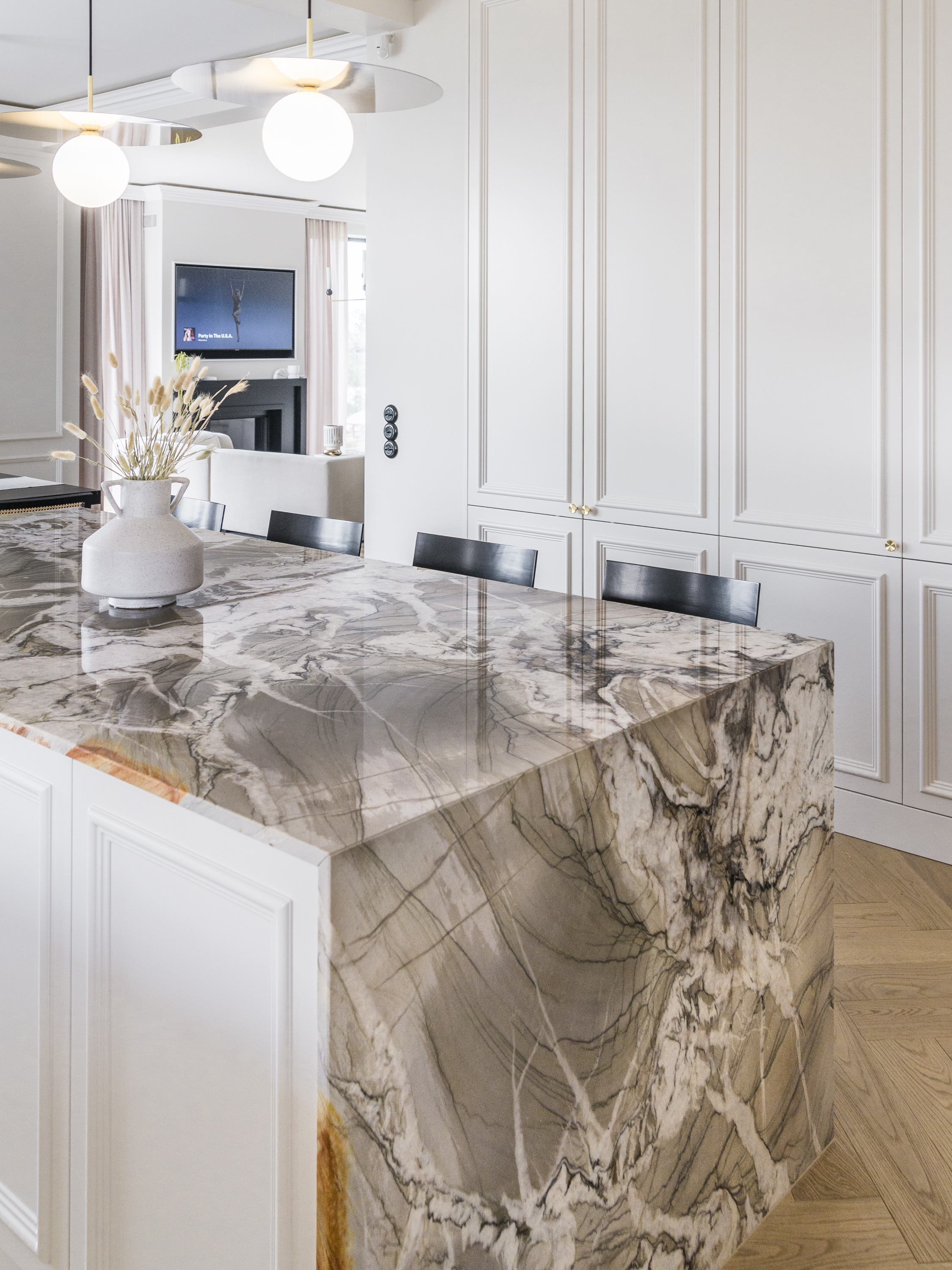 Jako jedyni mamy FOTOSLAB - przed montażem zobaczysz rzeczywisty wygląd blatu we wnętrzu. Na wizualizacji widać ułożenie smug, miejsce łączeń i każdą żyłkę prawdziwego kamienia.